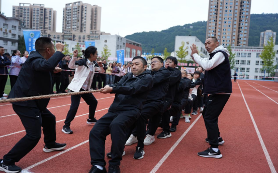 (拔河比赛现场,口号声、加油声响彻赛场,各队心往一处想、劲往一处使,将团队力量诠释得淋漓尽致)