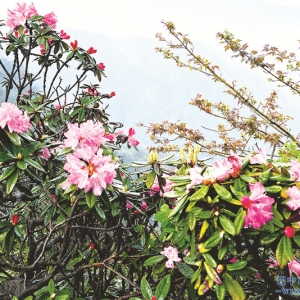 红粉相间的杜鹃花香炉山巅杜鹃花开游客在香炉山赏花拍照当前,香炉山上的杜鹃花已进入观赏期。各色杜鹃花俏立枝头,粉红、白色、紫色的杜鹃花在阳光下摇曳生姿,轻柔地覆盖在山间各处。高山杜鹃植株丰满,叶大花硕, ...